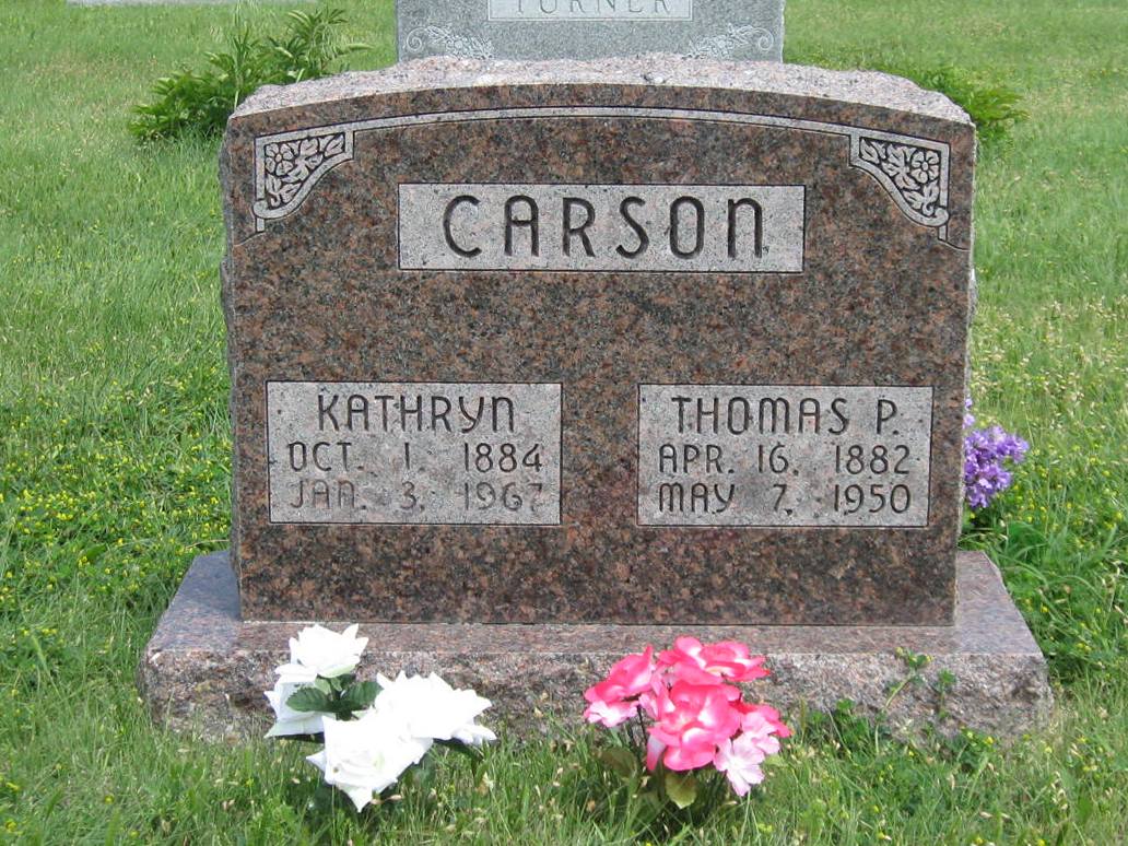 | Carson | Kathryn | 10/1/1884 | 1/3/1967 | Same stone as Thomas P. Carson. Obit | | |