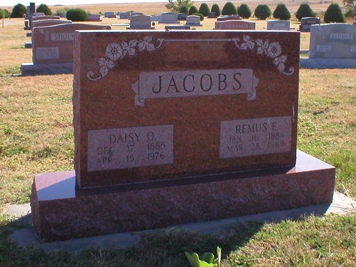 | Jacobs | Remus E. | 1/16/1884 | 3/28/1969 | Same stone as Daisy O. Jacobs. Obit | | |
