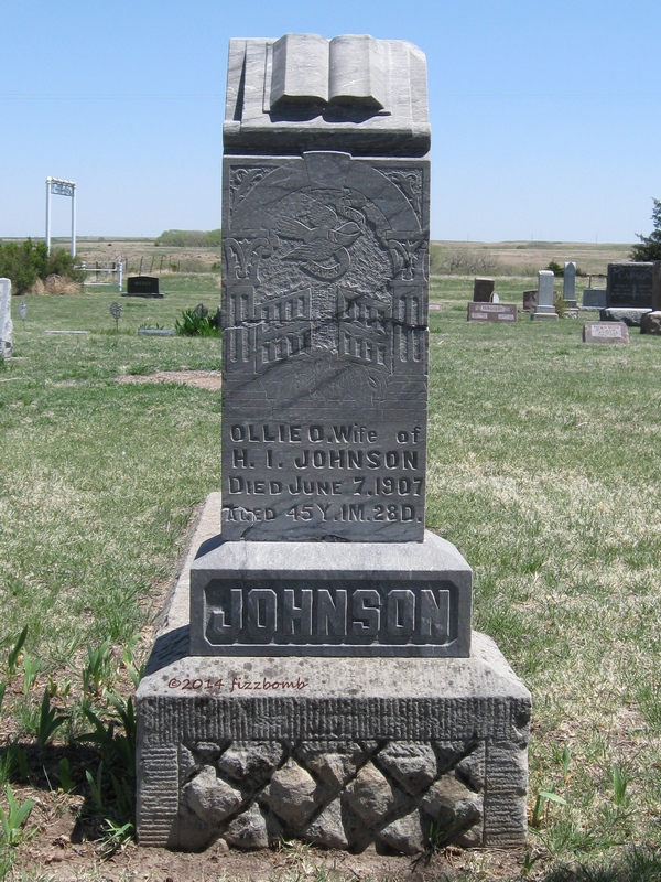 | Johnson | Olllie O. | 4/9/1862 | 6/7/1907 | Aged 45y 1m 28d; At Rest in Heaven | O. J. inscribed on a footstone. Full name was Anna Ohio (Brown) Johnson. Obit | |