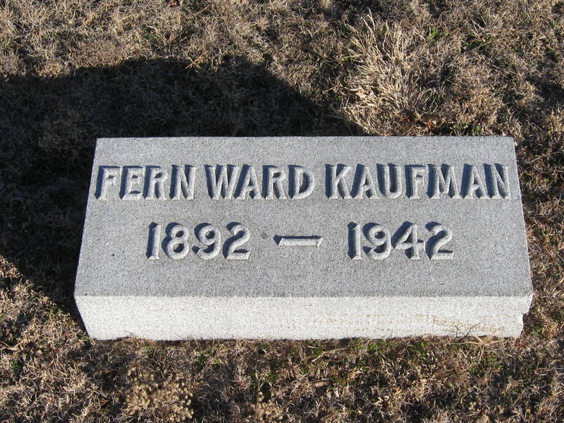 | Kaufman | Fern Alpha Ward | 1892 | 6/26/1942 | Large center WARD stone (tree grown up around it); small individualized stones. Burial permit on file in city office. Obit | | |