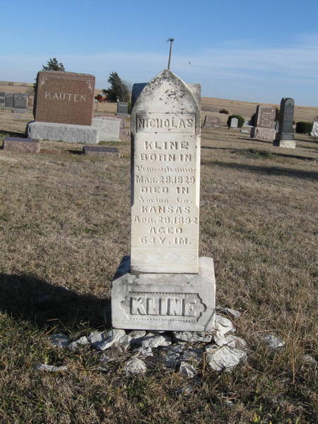 | Kline | Nicholas | 3/28/1829 | 4/28/1892 | Born in Pennsylvania; Aged 63y 1m; Died Norton County, Kansas | Stone is leaning due to crumbled foundation. | |