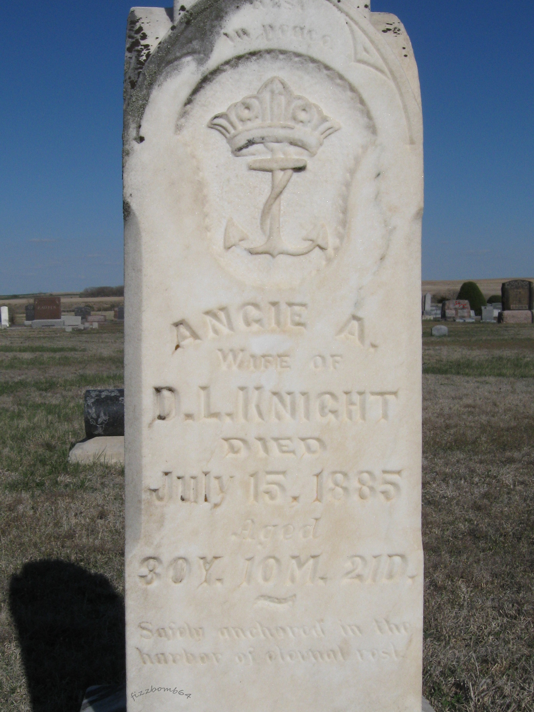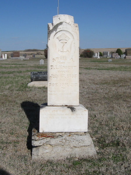 | Knight | Angie A. | 7/15/1885 | Wife of D. L. Knight; Aged 30y 10m 21d; Safely anchored in the harbor of eternal rest; Lord, She is as thine and not my own, Thou hast done me no wrong. | Inscription is signed J, Al, Timmy, Kerwin | | |
