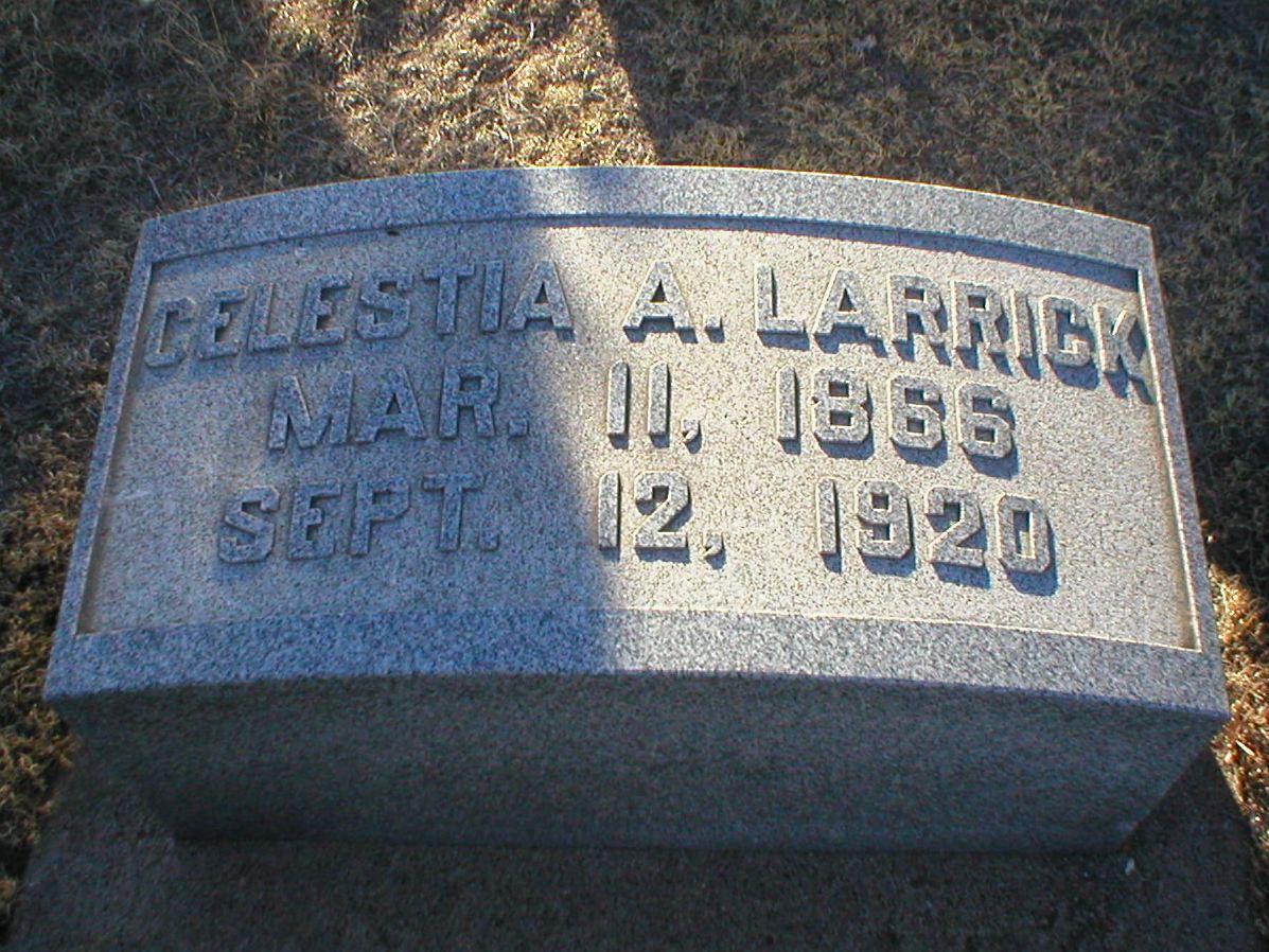 | Larrick | Celestia A. | 3/11/1866 | 9/12/1920 | LARRICK family stone surrounded by 6 individualized stones. Daughter of John Milton & Martha (Roseborough) Hardman. Obit | | |