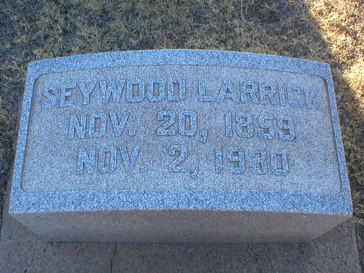 | Larrick | Seywood | 11/20/1859 | 11/2/1930 | LARRICK family stone surrounded by 6 individualized stones. Son of Asa and Sarah (Hardesty) Larrick. | | |