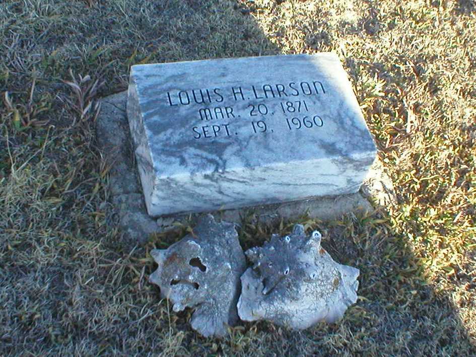 | Larson | Louis Hans | 3/20/1871 | 9/19/1960 | Unmarked. Son of Lars and Marie (Mortenson) Larson. Funeral record and memorial card on file at city office. Occupation: farmer. | | |