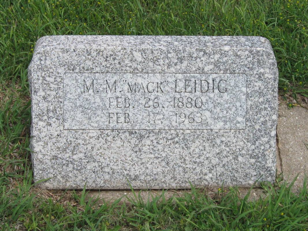 | Leidig | M. M. "Mack" | 2/26/1880 | 2/17/1963 | Same stone as Frances A. Leidig. Individually inscribed footstone. | | |