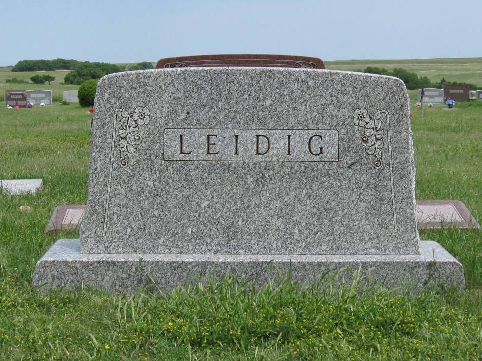 | Leidig | Jessie Mae | 1885 | 1956 | Large center LEIDIG stone; individualized footstones. | | |