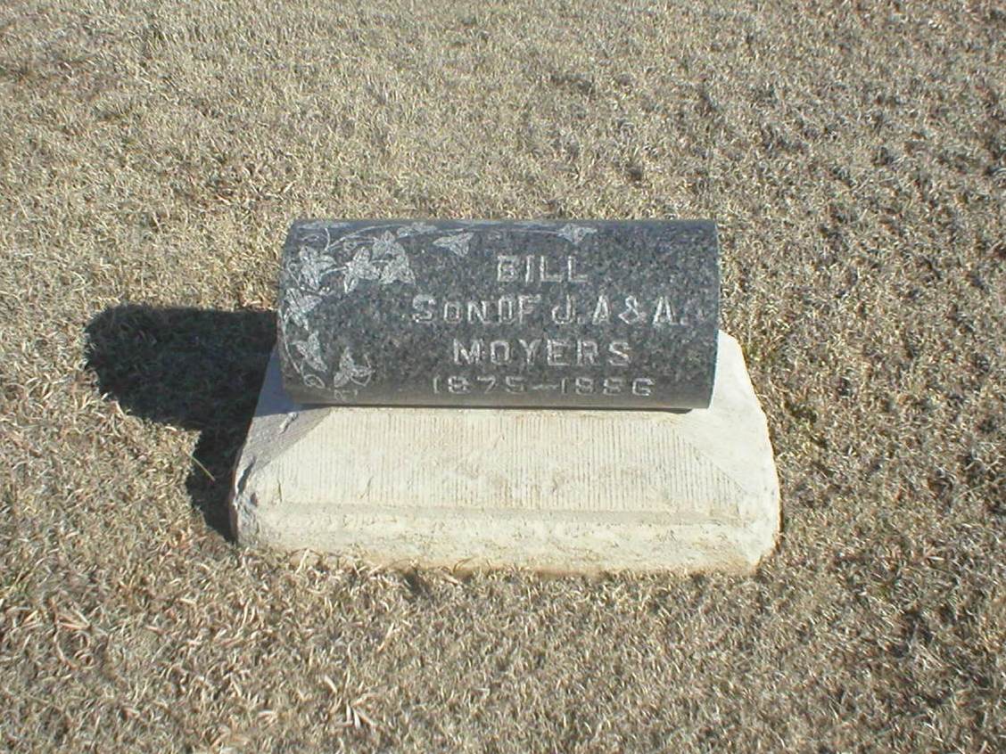 | Moyers | Bill | 1875 | 4/1/1886 | Son of J A & A Moyers | Cylindrical "pillow" stone. Obit for his mother in the Lenora News Aug 4, 1926 on file at Norton Historical Society. | |