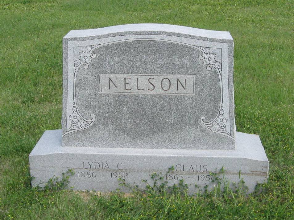 | Nelson | Lydia C. | 1886 | 1952 | Same stone as Claus Nelson. Obit | | |