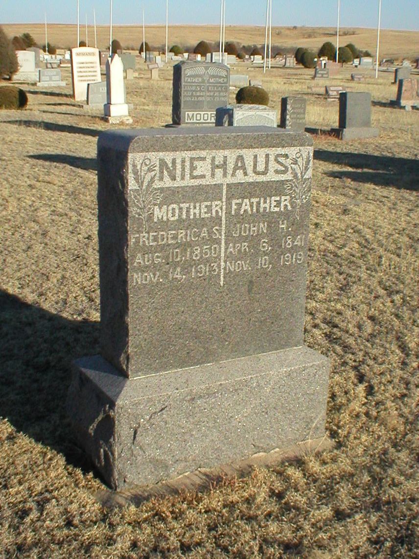 | Niehaus | John H. | 4/6/1841 | 11/10/1919 | Father | Same stone as Frederica S. Niehaus. | |