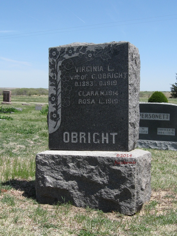 | Obright | Virginia L. | 1883 | 1919 | Wife of Charles Obright | Same stone as daughters Clara M and Rosa L. Obright. | |