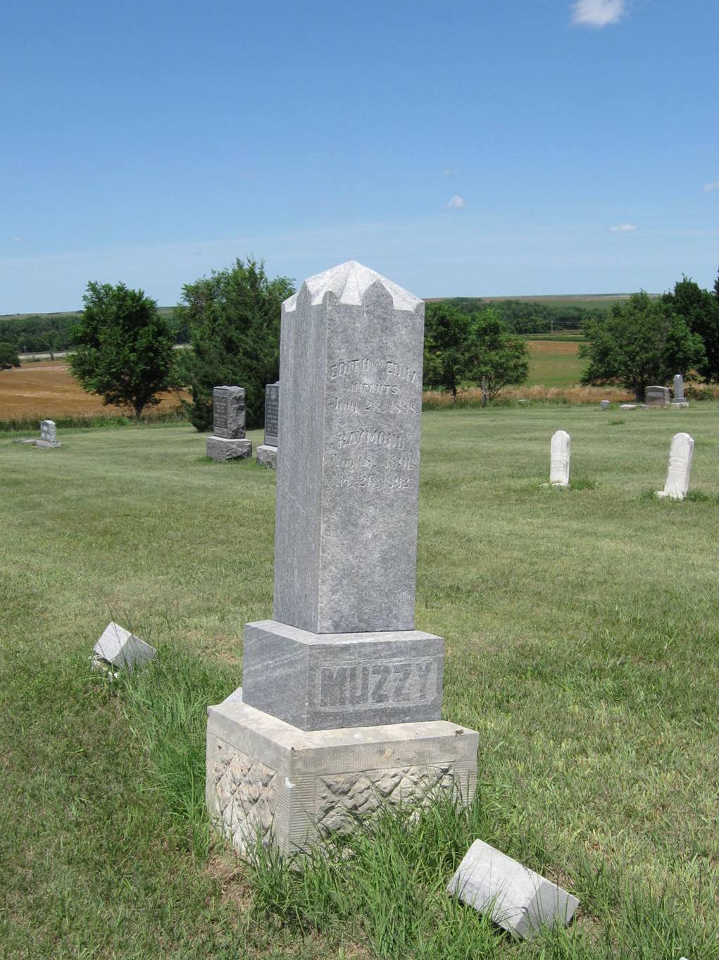 | Muzzy | Edith | 7/23/1888 | Infants; Small stone: Edith and Edna | Same stone as Wm., Milly Bryan, and Raymond Muzzy. | | |