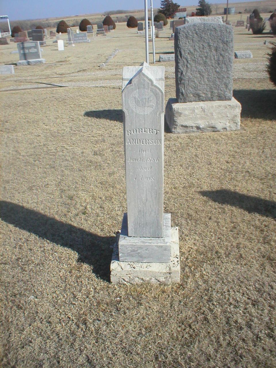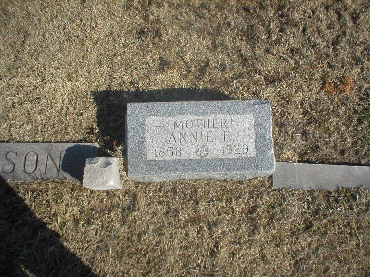 | Anderson | Annie E. | 2/2/1858 | 2/28/1929 | Mother | Large ANDERSON family stone; individual footstones with names & dates. Eastern Star emblem. Obit on file at Norton Co. Genealogical Society. | |