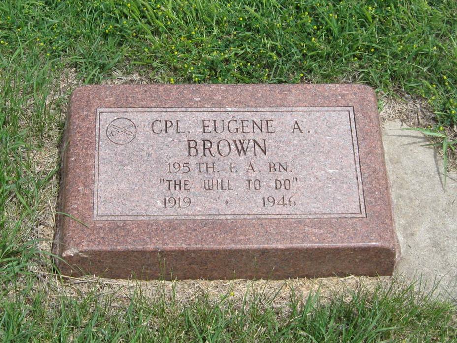| Brown | Eugene A. | 7/27/1919 | 1/27/1946 | The Will to Do; Military stone; CPL 195th Field Arty BN; BRONZE STAR MEDAL | Obit | |