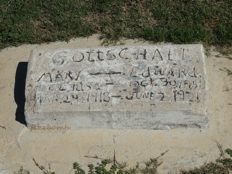 | Gottschall | Edward | 10/30/1851 | 6/2/1921 | Homemade concrete stone, inscriptions worn. Same stone as Mary Gottschall | | |