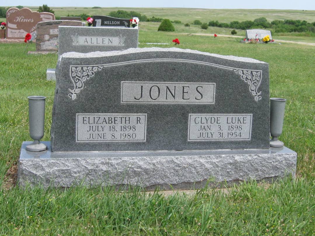 | Jones | Clyde Luke | 1/3/1898 | 7/31/1954 | Same stone as Elizabeth R Jones. | | |