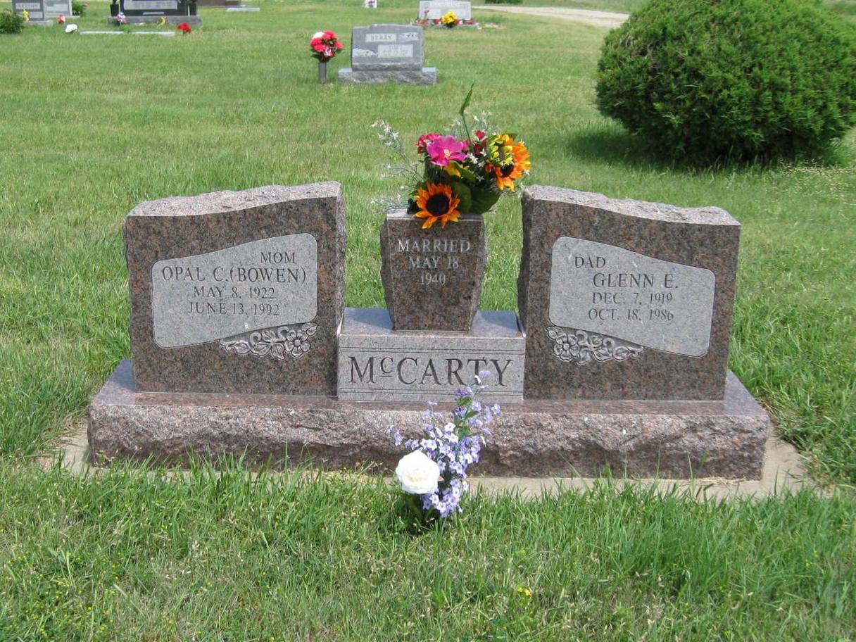 | McCarty | Opal C. (Bowen) | 5/8/1922 | 6/13/1992 | Mother; Married May 18, 1914 | Same stone as Glenn E. McCarty. | |